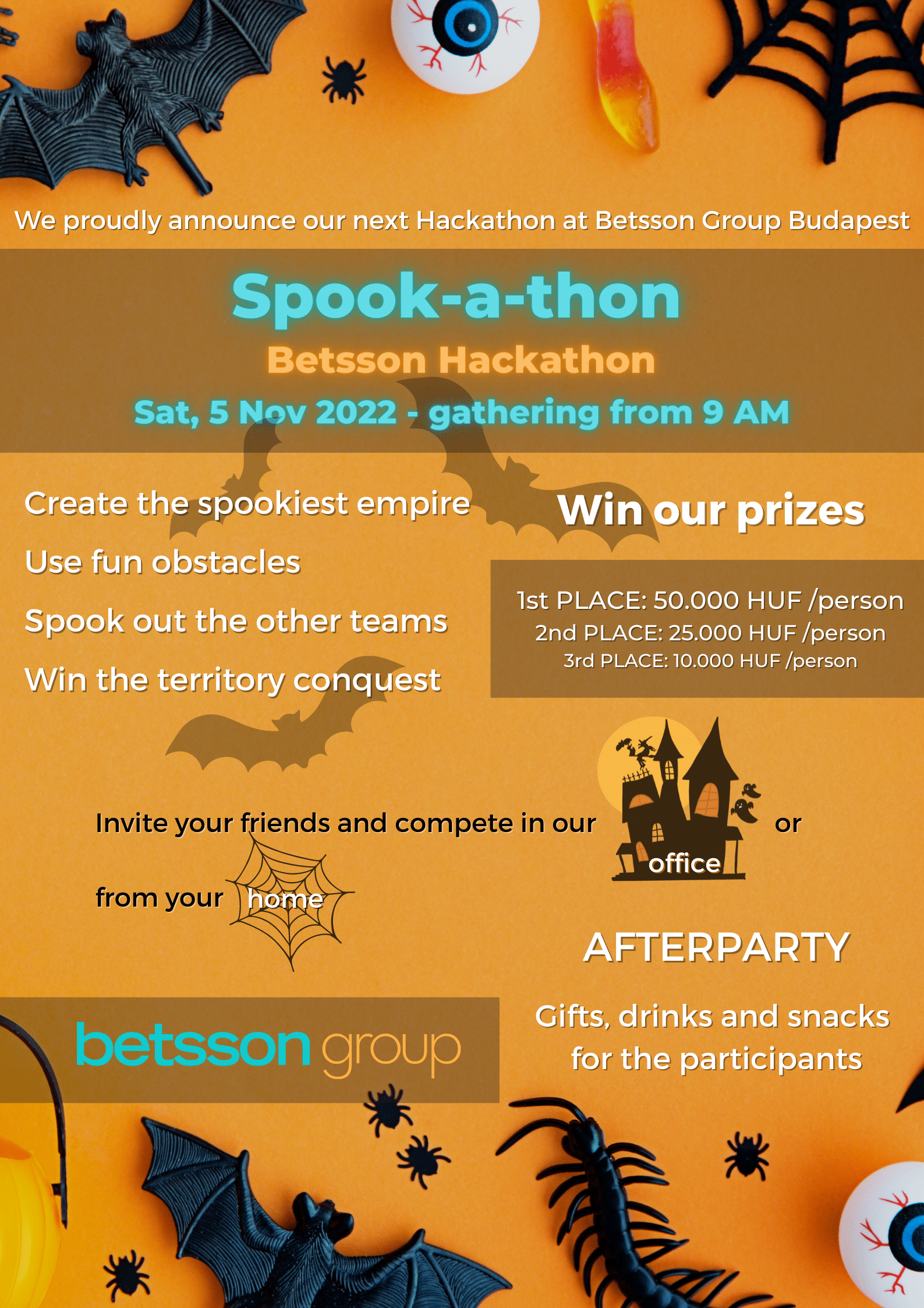 Create the spookiest empire, use fun obstacles, spook out the other teams, and win the territory conquest! PRIZES (MediaMarkt vouchers) 1st place: 50.000HUF/person 2nd place: 25.000HUF/person 3rd place: 10.000HUf/person HOW – Put together your team of 3-4 devs and register here: https://forms.gle/Vap6DzgaeiKrwH886 – Decide on a team name, write down your team story and start brushing up on your skills! – We … Continued