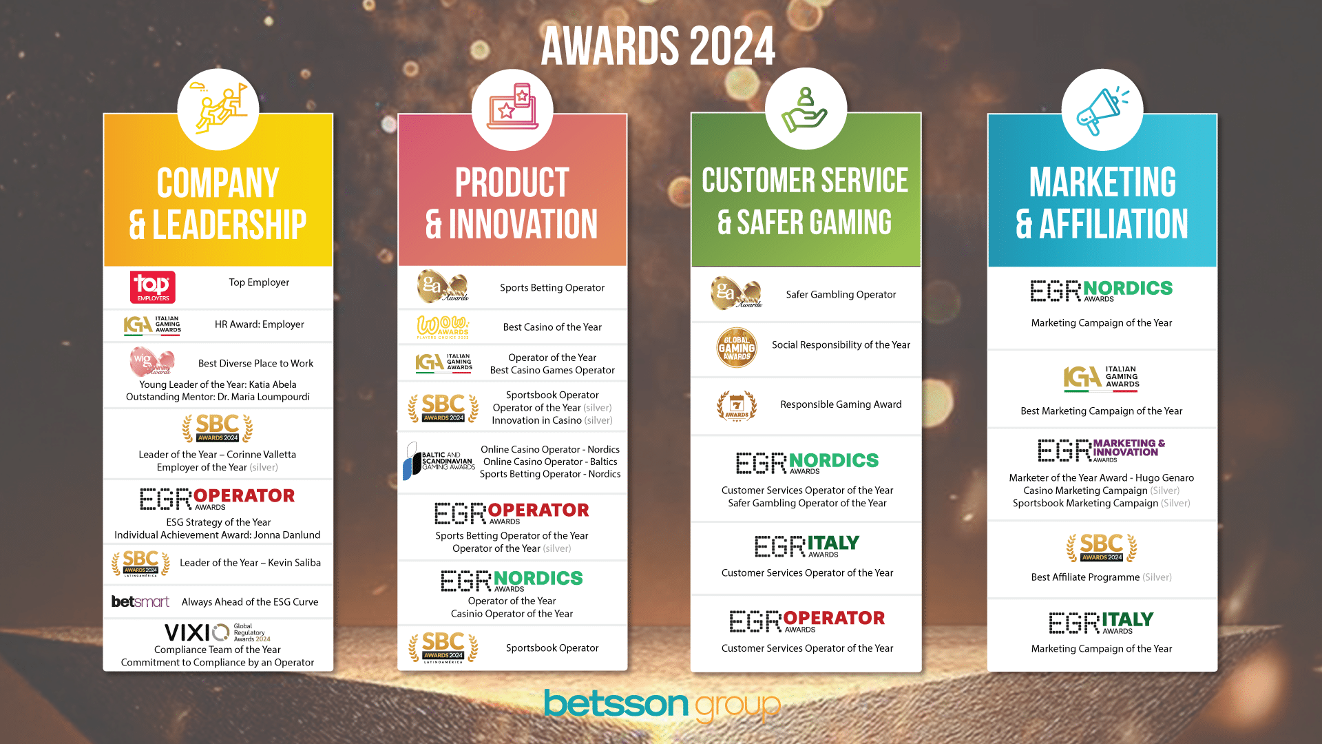 2024 has been a great year for Betsson Group, with a remarkable 42 awards won across various categories and regions – that’s 24% more wins than in 2023. This extraordinary achievement not only underscores the company’s excellence but also highlights the incredible talent, dedication, and innovation of Betssonites around the globe. From customer service to safer gaming, marketing, and leadership, these accolades span a wide array of areas, showcasing the breadth and depth of expertise within the company.