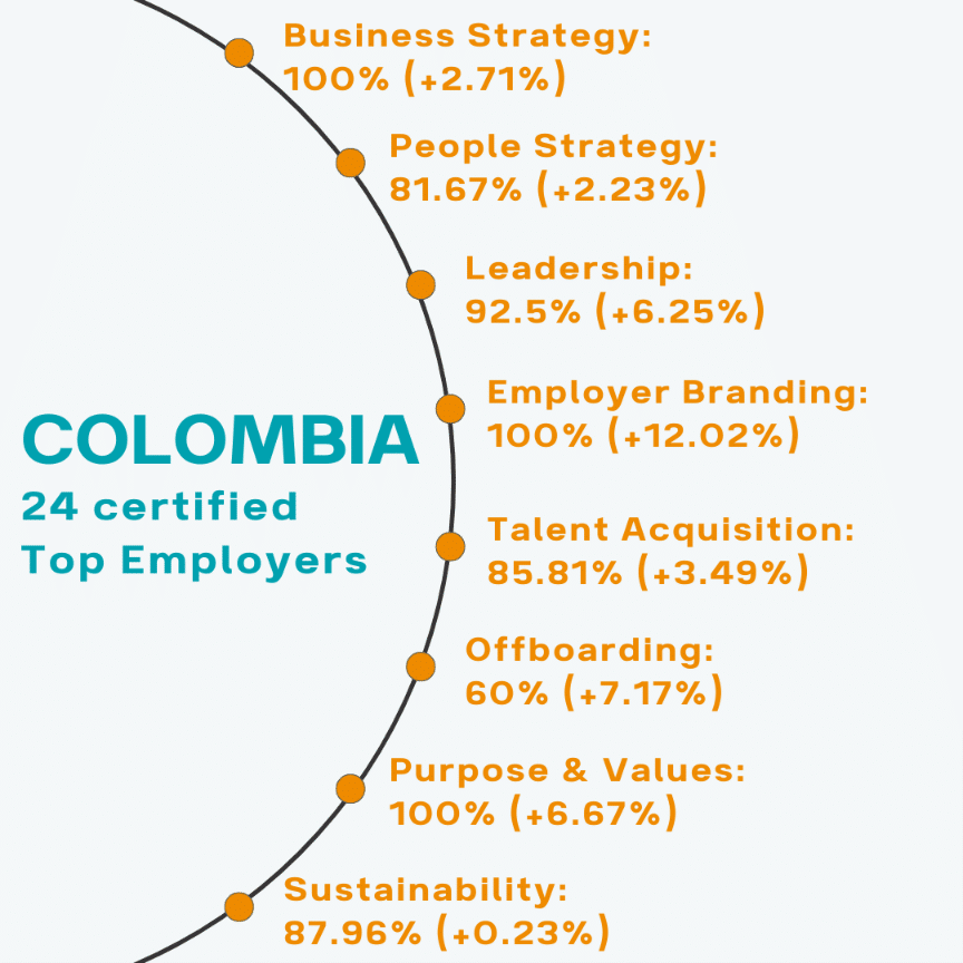 Taking a further deeper look within Colombia itself, with 24 certified Top Employers in total, the company is also seen to be exceeding expectations in several areas: